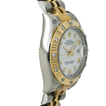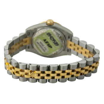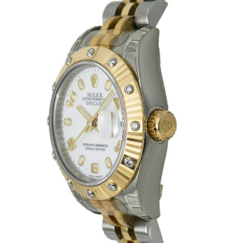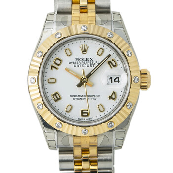 Silver-tone stainless steel case with a silver-tone 18kt yellow gold and stainless steel bracelet. Fixed 18kt yellow gold diamond set bezel. White dial with gold-tone hands and Arabic numeral & index hour markers. Minute markers around the outer rim. Dial Type: Analog. Luminescent hands and markers. Date display at the 3 o'clock position. Rolex Calibre 2235 Automatic movement, containing 31 Jewels, bitting at 28800 vph, and has a power reserve of approximately 48 hours. Scratch resistant sapphire crystal. Screw down crown. Solid case back. Round case shape, case size: 26 mm, case thickness: 11 mm. Band width: 13 mm, band length: 6 inches. Fold over clasp. Water resistant at 100 meters / 330 feet. Functions: hour, minute, second, date, water resistant. Luxury watch style. Watch label: Swiss Made. Rolex Datejust White Dial Ladies Watch 179313WAJ.