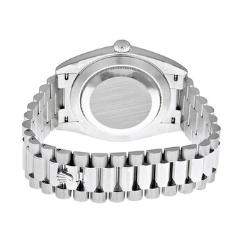 White platinum case with a white platinum Rolex president bracelet. Fixed white platinum bezel. Ice blue diagonal motif dial with luminous silver tone hands and index hour markers. Minute markers around the outer rim. Dial Type: Analog. Luminescent hands and markers. Date display at the 3 o'clock position. Day of the week display centered on the 12 o'clock. Rolex calibre 3255 automatic movement, based upon Rolex 3035, containing 31 Jewels, bitting at 28800 vph, and has a power reserve of approximately 70 hours. Scratch resistant sapphire crystal. Screw down crown. Solid case back. Round case shape. Case size: 40 mm. Concealed crown clasp. Water resistant at 100 meters / 330 feet. Functions: date, day, hour, minute, second, chronometer. Day Date 40 Series. Luxury watch style. Watch label: Swiss Made. Rolex Day Date 40 Ice Blue Diagonal Motif Dial Platinum President Automatic Men's Watch 228206IBLSP.