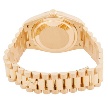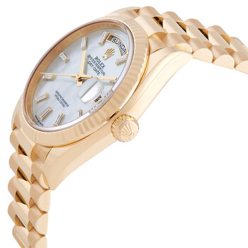 Yellow gold-tone 18kt yellow gold case with a yellow gold-tone 18kt yellow gold president bracelet. Fixed yellow gold-tone 18kt yellow gold bezel. White mother of pearl dial with yellow gold-tone hands and diamond hour markers. Dial Type: Analog. Date display at the 3 o'clock position. Rolex Calibre 3255 Automatic movement, based upon Rolex 3035, containing 31 Jewels, bitting at 28800 vph, and has a power reserve of approximately 70 hours. Scratch resistant sapphire crystal. Screw down crown. Solid case back. Round case shape, case size: 36 mm. Crown clasp. Water resistant at 100 meters / 330 feet. Functions: date, day, hour, minute, second, chronometer, shock resistant, magnetic resistant. Additional Info: original box, international warranty card, manual (complete accessories). Day Date Series. Luxury watch style. Watch label: Swiss Made. Item Variations: 128238-0123. Rolex Day Date Automatic Chronometer Diamond White Mother of Pearl Dial Unisex Watch M128238-0123.