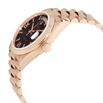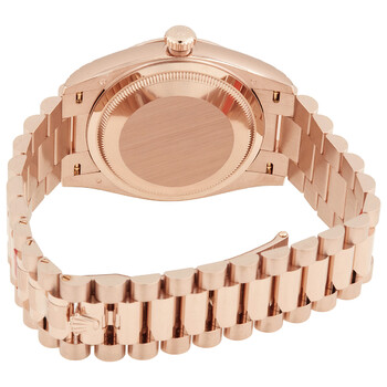 18kt everose gold case with a 18kt everose gold president bracelet. Fixed fluted 18kt everose gold bezel. Eisenkiesel dial with everose gold hands and diamond-set index hour markers. Diamond-set Roman numerals appear at the 6 and 9 o'clock positions. Dial Type: Analog. Date display at the 3 o'clock position. Day of the week display centered on the 12 o'clock positions. Rolex calibre 3255 automatic movement, based upon Rolex 3035, containing 31 Jewels, bitting at 28800 vph, and has a power reserve of approximately 70 hours. Scratch resistant sapphire crystal. Screw down crown. Solid case back. Round case shape. Case size: 36 mm. Crown clasp. Water resistant at 100 meters / 330 feet. Functions: date, day, hour, minute, second, chronometer, shock resistant, magnetic resistant. Day-date 36 Series. Luxury watch style. Watch label: Swiss Made. Rolex Day-Date 36 Automatic 18kt Everose Gold Diamond Eisenkiesel Dial Ladies Watch M128235-0041.