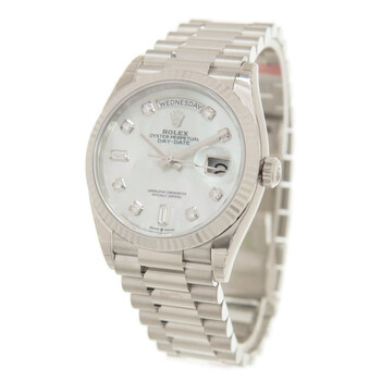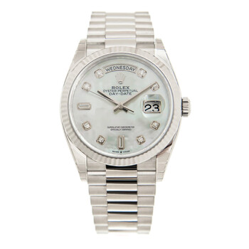 18kt white gold case with a 18kt white gold rolex president bracelet. Fixed- fluted 18kt white gold bezel. Mother of pearl dial with silver-tone hands and diamond hour markers. Dial Type: Analog. Date display at the 3 o'clock position. Rolex Calibre 3255 Automatic movement, based upon Rolex 3035, containing 31 Jewels, bitting at 28800 vph, and has a power reserve of approximately 70 hours. Scratch resistant sapphire crystal. Screw down crown. Solid case back. Round case shape. Case size: 36 mm. Water resistant at 100 meters / 330 feet. Functions: date, day, hour, minute, second. Luxury watch style. Watch label: Swiss Made. Rolex Day-Date 36 Automatic Mother of Pearl Diamond Dial President Watch 128239MDP.m128239-0007, m128239, 128239-0007, 128239
