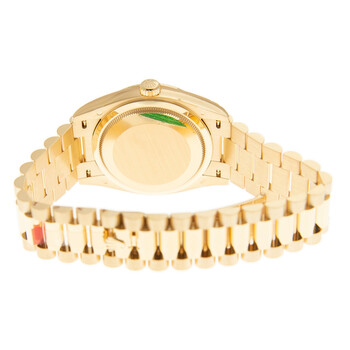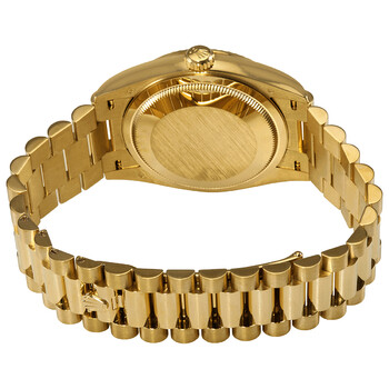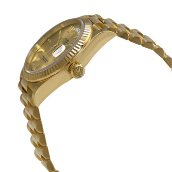 18kt yellow gold case with a 18kt yellow gold Rolex president bracelet. Fixed fluted 18kt yellow gold bezel. Champagne dial with yellow gold hands and index hour markers. Minute markers around the outer rim. Dial Type: Analog. Date display at the 3 o'clock position. Day of the week display centered on the 12 o'clock position. Rolex calibre 3255 automatic movement, based upon Rolex 3035, containing 31 Jewels, bitting at 28800 vph, and has a power reserve of approximately 70 hours. Scratch resistant sapphire crystal. Screw down crown. Solid case back. Round case shape, case size: 36 mm. Oyster clasp. Water resistant at 100 meters / 330 feet. Functions: date, day, hour, minute, second. Day-date 36 Series. Luxury watch style. Watch label: Swiss Made. Rolex Day-Date 36 Champagne Dial 18kt Yellow Gold President Watch 128238CSP.