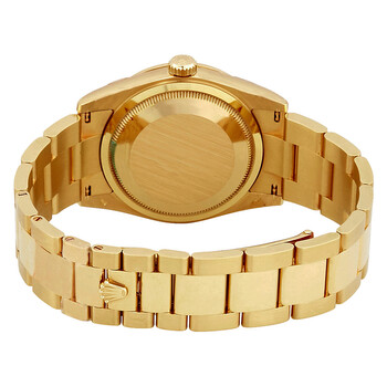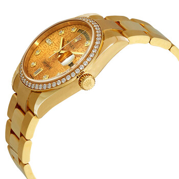 18kt yellow gold case with a 18kt yellow gold Rolex oyster bracelet. Fixed 18kt yellow gold bezel set with diamonds. Champagne jubilee dial with yellow gold-tone hands and diamonds hour markers. Baguette-cut diamonds mark the 6 and 9 o'clock positions. Dial Type: Analog. Date display at the 3 o'clock position. Day of the week display centered on the 12 o'clock position. Rolex calibre 3155 automatic movement with a 48-hour power reserve. Scratch resistant sapphire crystal. Screw down crown. Solid case back. Round case shape. Case size: 36 mm. Water resistant at 100 meters / 330 feet. Functions: date, day, hour, minute, second. Luxury watch style. Watch label: Swiss Made. Rolex Day-Date 36 Champagne Jubilee Dial Automatic Diamond Ladies 18kt Yellow Gold Oyster Watch 118348CJDO.