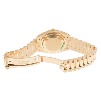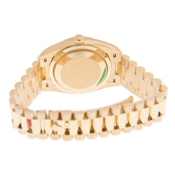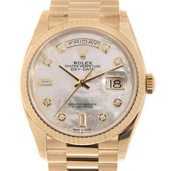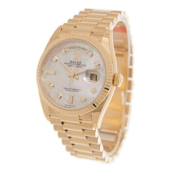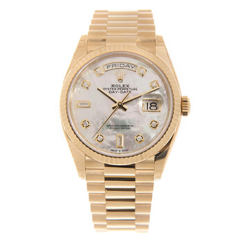 18kt yellow gold case with a 18kt yellow gold Rolex president bracelet. Fixed fluted 18kt yellow gold bezel. Mother of pearl dial with yellow gold hands and diamond hour markers. Dial Type: Analog. Date display at the 3 o'clock position. day of the week display centgered on the 12 o'clock position. Rolex calibre 3255 automatic movement, based upon Rolex 3035, containing 31 Jewels, bitting at 28800 vph, and has a power reserve of approximately 70 hours. Scratch resistant sapphire crystal. Screw down crown. Solid case back. Round case shape. Case size: 36 mm. Oysterlock clasp. Water resistant at 100 meters / 330 feet. Functions: date, day, hour, minute, second. Day-date 36 Series. Luxury watch style. Watch label: Swiss Made. Rolex Day-Date 36 Mother of Pearl Diamond Automatic 18kt Yellow Gold President Watch 128238MDP.