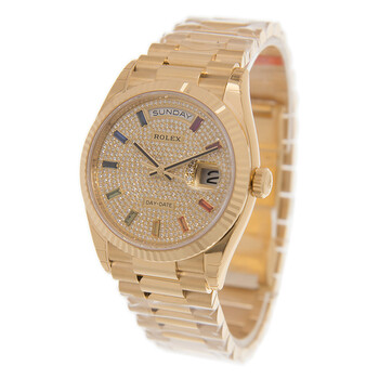 18kt yellow gold case with a 18kt yellow gold rolex president bracelet. Fixed- fluted 18kt yellow gold bezel. Diamond pave dial with yellow gold hands and index hour markers. Dial Type: Analog. Date display at the 3 o'clock position. Rolex Calibre 3255 Automatic movement, based upon Rolex 3035, containing 31 Jewels, bitting at 28800 vph, and has a power reserve of approximately 70 hours. Scratch resistant sapphire crystal. Screw down crown. Solid case back. Round case shape. Case size: 36 mm. Water resistant at 100 meters / 330 feet. Functions: date, day, hour, minute, second. Additional Info: dial set with 10 baguette-cut, rainbow-coloured sapphires. Luxury watch style. Watch label: Swiss Made. Rolex Day-Date 36 Rainbow Baguette Dial 18kt Yellow Gold President Watch 128238DSP.