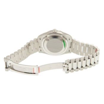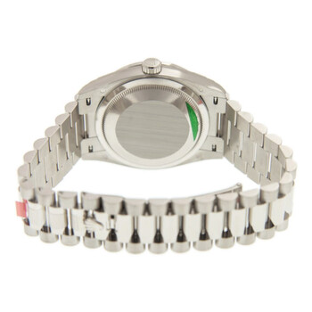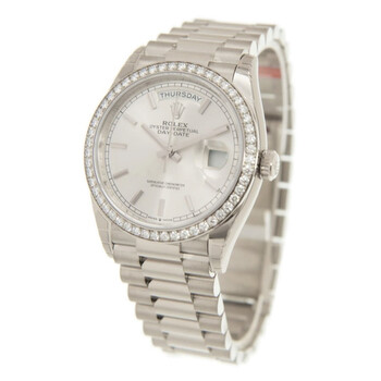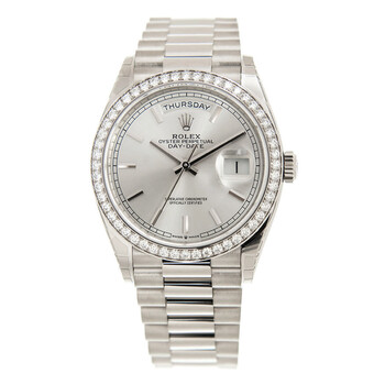 18kt white gold case with a 18kt white gold rolex president bracelet. Fixed diamond set bezel. Silver dial with silver-tone hands and index hour markers. Dial Type: Analog. Date display at the 3 o'clock position. Rolex Calibre 3255 Automatic movement, based upon Rolex 3035, containing 31 Jewels, bitting at 28800 vph, and has a power reserve of approximately 70 hours. Scratch resistant sapphire crystal. Screw down crown. Solid case back. Round case shape. Case size: 36 mm. Folding clasp. Water resistant at 100 meters / 330 feet. Functions: date, day, hour, minute, second. Luxury watch style. Watch label: Swiss Made. Rolex Day-Date 36 Silver Dial 18kt White Gold President Watch 128349SSP. m128349rbr-0001, 128349rbr-0001, 128349rb