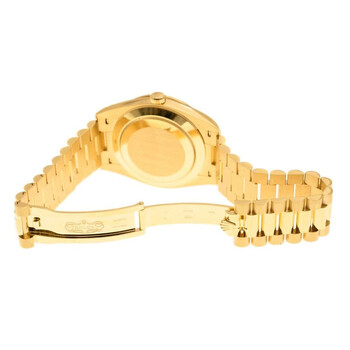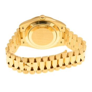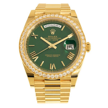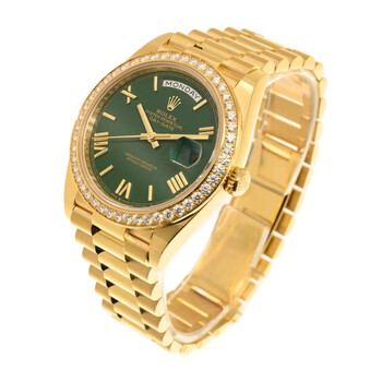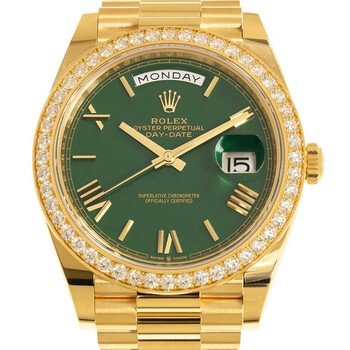 18kt yellow gold case with a 18kt yellow gold rolex president bracelet. Fixed bezel with diamond set. Green dial with yellow gold hands and Roman numeral hour markers. Dial Type: Analog. Date display at the 3 o'clock position. Rolex Calibre 3255 Automatic movement, based upon Rolex 3035, containing 31 Jewels, bitting at 28800 vph, and has a power reserve of approximately 70 hours. Scratch resistant sapphire crystal. Screw down crown. Solid case back. Round case shape, case size: 40 mm. Concealed folding crown clasp. Water resistant at 100 meters / 330 feet. Functions: date, day, hour, minute, second. Day-date 40 Series. Luxury watch style. Watch label: Swiss Made. Rolex Day-Date 40 Automatic Green Dial Men's 18kt Yellow Gold President Watch M228348rbr-0040.
