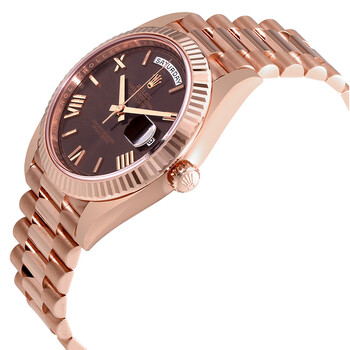 Rose gold-tone 18kt everose gold case with a rose gold-tone 18kt everose gold rolex president bracelet. Fixed fluted rose gold-tone 18kt everose gold bezel. Chocolate dial with rose gold-tone hands and Roman numeral and index hour markers. Minute markers around the outer rim. Dial Type: Analog. Date display at the 3 o'clock position. day display at 12 o'clock. Rolex Calibre 3255 automatic movement with a 70-hour power reserve. Scratch resistant sapphire crystal. Screw down crown. Solid case back. Round case shape. Case size: 40 mm. Concealed crown clasp. Water resistant at 100 meters / 330 feet. Functions: date, day, hour, minute, second, chronometer. Luxury watch style. Watch label: Swiss Made. Item Variations: 228235-83415. Rolex Day-Date 40 Chocolate Dial 18K Everose Gold President Automatic Men's Watch 228235CHRP.