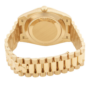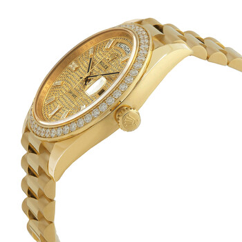 18kt yellow gold case with a 18kt yellow gold president bracelet. Fixed bezel with diamond set. Diamond-paved dial with yellow gold hands and 10 baguette-cut diamonds hour markers. Dial Type: Analog. Date display at the 3 o'clock position. Rolex Calibre 3255 Automatic movement, based upon Rolex 3035, containing 31 Jewels, bitting at 28800 vph, and has a power reserve of approximately 70 hours. Scratch resistant sapphire crystal. Screw down crown. Solid case back. Round case shape, case size: 40 mm. Concealed folding crown clasp. Water resistant at 100 meters / 330 feet. Functions: date, day, hour, minute, second. Day-date 40 Series. Luxury watch style. Watch label: Swiss Made. Rolex Day-Date 40 Diamond Paved Dial Men's 18kt Yellow Gold President Watch M228348rbr-0037.