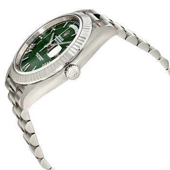18kt white gold case with a 18kt white gold president bracelet. Fluted 18kt white gold bezel. Olive green dial with silver-tone hands and alternating index and Roman numeral hour markers. Minute markers around the outer rim. Dial Type: Analog. Date display at the 3 o'clock position. Day of the week display centered on the 12 o'clock position. Rolex calibre 3255 automatic movement with a 70-hour power reserve. Scratch resistant mineral crystal. Screw down crown. Solid case back. Case size: 40 mm. Round case shape. Concealed fold over clasp. Water resistant at 100 meters / 330 feet. Functions: date, day, hour, minute, second, chronometer. Luxury watch style. Watch label: Swiss Made. Rolex Day-Date Automatic 18 Carat White Gold President Men's Watch 228239GNSRP.