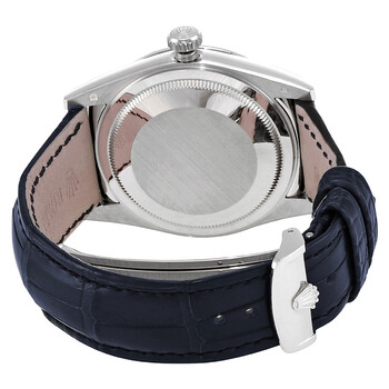 18kt white gold case with a blue leather strap. Fixed 18kt white gold bezel. Blue dial with silver-tone hands and index hour markers. Minute markers around the outer rim. Dial Type: Analog. Luminescent hands and markers. Date display at the 3 o'clock position. day display at the 12 o'clock position. Rolex Calibre 3155 Automatic movement, based upon Rolex 3055, containing 31 Jewels, bitting at 28800 vph, and has a power reserve of approximately 48 hours. Scratch resistant sapphire crystal. Screw down crown. Solid case back. Round case shape, case size: 36 mm. Deployment buckle clasp. Water resistant at 100 meters / 330 feet. Functions: date, day, hour, minute, second, chronometer. Day-date Series. Luxury watch style. Watch label: Swiss Made. Rolex Day-Date Automatic Chronometer Blue Dial Men's Watch 118139.