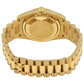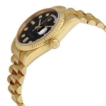 18kt yellow gold case with a 18kt yellow gold rolex president bracelet. Fixed fluted 18kt yellow gold bezel. Black dial with yellow gold-tone hands and diamond hour markers. Minute markers around the outer rim. Dial Type: Analog. Date display at 3 o'clock; day display at 12 o'clock.. Rolex Calibre 3155 automatic movement with a 48-hour power reserve. Scratch resistant sapphire crystal. Screw down crown. Solid case back. Round case shape. Case size: 36 mm. Concealed crown clasp. Water resistant at 100 meters / 330 feet. Functions: date, day, hour, minute, second, chronometer. Luxury watch style. Watch label: Swiss Made. Item Variations: 118238, 118238-BKDP, Rolex-118238, Rolex-118238-BKDP. Rolex Day-Date Black Dial 18K Yellow Gold President Automatic Men's Watch 118238BKDP.