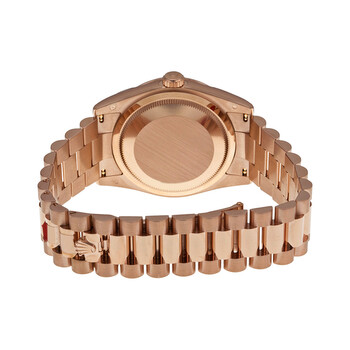 18k everose gold case with a 18k everose gold Rolex President bracelet. Fixed - fluted 18k everose gold bezel. Champagne dial with rose-gold tone hands and diamond hour markers. Minute markers around the outer rim. Dial Type: Analog. Date display at 3 o'clock; day display at 12 o'clock.. Automatic movement. Scratch resistant sapphire crystal. Screw down crown. Solid case back. Case diameter: 36 mm. Round case shape. Concealed Crown clasp. Water resistant at 100 meters / 330 feet. Functions: date, day, hour, minute, second. Luxury watch style. Watch label: Swiss Made. Rolex Day-Date Champagne Dial 18K Everose Gold President Automatic Ladies Diamond Watch 118235CDP.