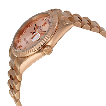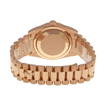 18k everose gold case with a 18k everose gold Rolex President bracelet. Fixed - fluted 18k everose gold bezel. Champagne dial with rose-gold tone hands and Roman numeral hour markers. Minute markers around the outer rim. Dial Type: Analog. Date display at 3 o'clock; day display at 12 o'clock.. Automatic movement. Scratch resistant sapphire crystal. Screw down crown. Solid case back. Case diameter: 36 mm. Round case shape. Concealed Crown clasp. Water resistant at 100 meters / 330 feet. Functions: date, day, hour, minute, second. Luxury watch style. Watch label: Swiss Made. Rolex Day-Date Champagne Dial 18K Everose Gold President Automatic Men's Watch 118235CRP.