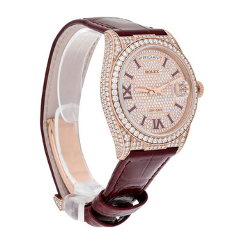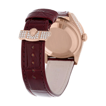 Rose gold-tone diamond set case with a burgandy crocodile leather strap. Fixed bezel with diamond set. Diamonds dial with rose gold-tone hands and Roman numeral hour markers. Dial Type: Analog. Date display at the 3 o'clock position, day display at the 12 o'clock position. Automatic movement with a 70-hour power reserve. Scratch resistant sapphire crystal. Screw down crown. Solid case back. Round case shape, case size: 36 mm. Fold over clasp. Water resistant at 100 meters / 330 feet. Functions: chronograph, hour, minute, second. Daydate Series. Dress watch style. Watch label: Swiss Made. Item Variations: M128155RBR-0002, 128155RBR-0002. Rolex Daydate Chronograph Automatic Diamond Ladies Watch M128155RBR-0002.