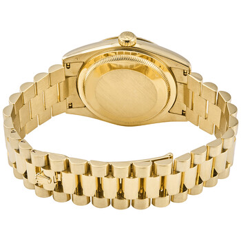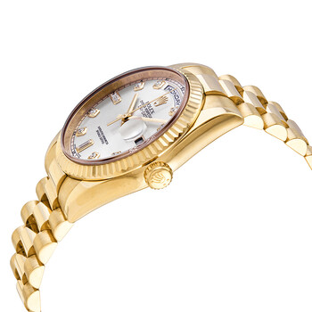 18kt yellow gold case with a 18kt yellow gold rolex president bracelet. Fixed fluted 18kt yellow gold bezel. Silver dial with yellow gold-tone hands and diamond hour markers. Minute markers around the outer rim. Dial Type: Analog. Date display at 3 o'clock; day display at 12 o'clock.. Rolex Calibre 3155 automatic movement with a 48-hour power reserve. Scratch resistant sapphire crystal. Screw down crown. Solid case back. Round case shape. Case size: 36 mm. Concealed crown clasp. Water resistant at 100 meters / 330 feet. Functions: date, day, hour, minute, second, chronometer. Luxury watch style. Watch label: Swiss Made. Rolex Day-Date Silver Dial 18K Yellow Gold President Automatic Men's Watch 118238SDP.
