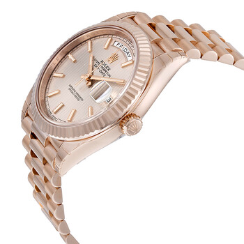 18k everose gold case with a 18k everose gold Rolex President bracelet. Fixed - fluted 18k everose gold bezel. Sundust stripe dial with rose-gold tone hands and index hour markers. Minute markers around the outer rim. Dial Type: Analog. Date display at 3 o'clock; day display at 12 o'clock.. Rolex Calibre 3255 automatic movement with about 70 hours of power reserve. Scratch resistant sapphire crystal. Screw down crown. Solid case back. Case size: 40 mm. Round case shape. Concealed crown clasp. Water resistant at 100 meters / 330 feet. Functions: date, day, hour, minute, second. Luxury watch style. Watch label: Swiss Made. Rolex Day-Date Sundust Stripe Dial 18K Everose Gold Automatic Men's Watch 228235SNSSP.