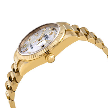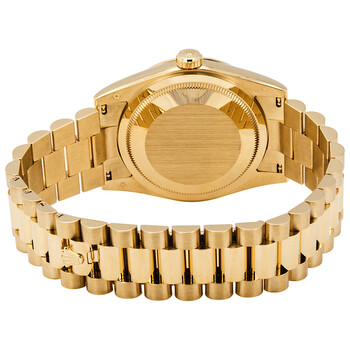 18kt yellow gold case with a 18kt yellow gold rolex president bracelet. Fixed fluted 18kt yellow gold bezel. White mother-of-pearl dial with yellow gold-tone hands and diamond hour markers. Dial Type: Analog. Date display at 3 o'clock; day display at 12 o'clock.. Rolex Calibre 3155 automatic movement with a 48-hour power reserve. Scratch resistant sapphire crystal. Screw down crown. Solid case back. Round case shape. Case size: 36 mm. Concealed crown clasp. Water resistant at 100 meters / 330 feet. Functions: date, day, hour, minute, second, chronometer. Luxury watch style. Watch label: Swiss Made. Item Variations: 118238, 118238-MDP , Rolex-118238, Rolex-118238-MDP 118238, 118238-MDP, Rolex-11. Rolex Day-Date White Mother-Of-Pearl Dial 18K Yellow Gold President Automatic Men's Watch 118238MDP.