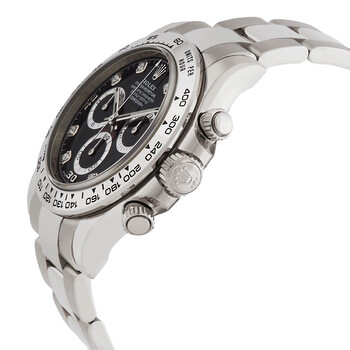 18kt white gold case with a 18kt white gold oyster bracelet. Fixed tachymeter scale 18kt white gold bezel. Black dial with silver-tone hands and diamond hour markers. Minute markers around the outer rim. Dial Type: Analog. Luminescent hands. Chronograph - three sub-dials displaying: 60 second, 30 minute and 12 hour. Rolex Calibre 4130 Automatic movement, based upon Rolex 4030, containing 44 Jewels, bitting at 28800 vph, and has a power reserve of approximately 72 hours. Scratch resistant sapphire crystal. Screw down crown. Solid case back. Round case shape, case size: 40 mm. Fold over clasp with a safety release. Water resistant at 100 meters / 330 feet. Functions: chronograph, hour, minute, small second, chronometer. Additional Info: original box, manual (complete accessories). Daytona Series. Luxury watch style. Watch label: Swiss Made. Rolex Daytona Chronograph Automatic Chronometer Diamond Black Dial Men's Watch 116509-0055.