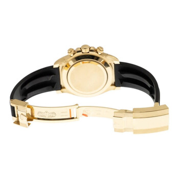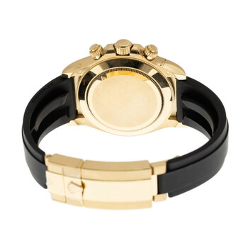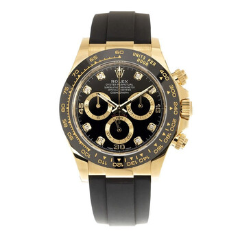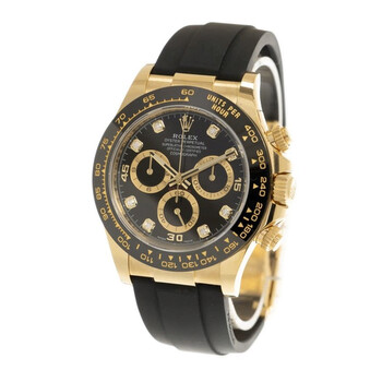 18kt yellow gold case with a black rubber strap. Fixed black bezel showing tachymeter bezel. Black dial with yellow gold-tone hands and diamond hour markers. Minute markers around the outer rim. Dial Type: Analog. Luminescent hands. Chronograph - three sub-dials displaying: 60 second, 30 minute and 12 hour. Rolex calibre 4130 automatic movement, based upon Rolex 4030, containing 44 Jewels, bitting at 28800 vph, and has a power reserve of approximately 72 hours. Scratch resistant sapphire crystal. Screw down crown. Solid case back. Round case shape. Case size: 40 mm. Oyster clasp. Water resistant at 100 meters / 330 feet. Functions: chronograph, hour, minute, small second, chronometer. Additional Info: original box, manual (complete accessories). Daytona Series. Luxury watch style. Watch label: Swiss Made. Rolex Daytona Chronograph Automatic Chronometer Diamond Black Dial Unisex Watch 116518BKDR.