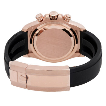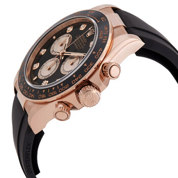 Rose gold-tone 18kt rose gold case with a black rubber strap. Fixed tachymeter scale black cerachrom bezel. Black dial with rose gold-tone hands and diamond hour markers. Minute markers around the outer rim. Dial Type: Analog. Luminescent hands and markers. Chronograph - three sub-dials displaying: 60 second, 30 minute and 12 hour. Rolex Calibre 4131 automatic movement with a 72-hour power reserve. Scratch resistant sapphire crystal. Screw down crown. Solid case back. Round case shape, case size: 40 mm. Fold over clasp with a safety release. Water resistant at 100 meters / 330 feet. Functions: chronograph, hour, minute, second. Additional Info: original box, manual (complete accessories). Daytona Series. Luxury watch style. Watch label: Swiss Made. Rolex Daytona Chronograph Automatic Diamond Black Dial Men's Watch 126515LN-0004.