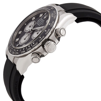 18kt white gold case with a black rubber strap. Fixed tachymeter scale black cerachrom bezel. Black dial with silver-tone hands and diamond hour markers. Minute markers around the outer rim. Dial Type: Analog. Luminescent hands and markers. Chronograph - three sub-dials displaying: 60 second, 30 minute and 12 hour. Rolex Calibre 4131 automatic movement with a 72-hour power reserve. Scratch resistant sapphire crystal. Screw down crown. Solid case back. Round case shape, case size: 40 mm. Fold over clasp with a safety release. Water resistant at 100 meters / 330 feet. Functions: chronograph, hour, minute, second. Additional Info: original box, manual (complete accessories). Daytona Series. Luxury watch style. Watch label: Swiss Made. Rolex Daytona Chronograph Automatic Diamond Black Dial Men's Watch 126519LN-0004.