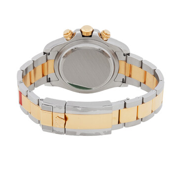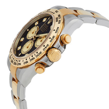 Silver-tone stainless steel case with a two-tone (silver-tone and yellow gold-tone) stainless steel and 18kt yellow gold oyster bracelet. Fixed tachymeter scale yellow gold-tone 18kt yellow gold bezel. Black dial with yellow gold-tone hands and diamond hour markers. Minute markers around the outer rim. Dial Type: Analog. Luminescent hands and markers. Chronograph - three sub-dials displaying: 60 second, 30 minute and 12 hour. Rolex Calibre 4131 automatic movement with a 72-hour power reserve. Scratch resistant sapphire crystal. Screw down crown. Solid case back. Round case shape, case size: 40 mm. Fold over clasp with a safety release. Water resistant at 100 meters / 330 feet. Functions: chronograph, hour, minute, second. Additional Info: original box, international warranty card, manual (complete accessories). Daytona Series. Luxury watch style. Watch label: Swiss Made. Rolex Daytona Chronograph Automatic Diamond Black Dial Men's Watch 126503-0002.