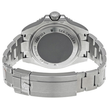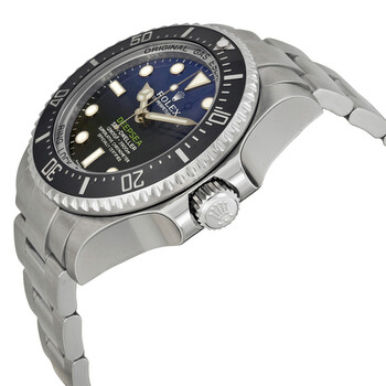 Stainless steel case with a stainless steel Rolex oyster bracelet. Uni-directional rotating stainless steel bezel with black cerachrom top ring. Deep blue dial with luminous silver-tone Mercedes-logo, sword, and Breguet-style shape hands and dot hour markers. Minute markers around the outer rim. Dial Type: Analog. Luminescent hands and markers. Date display at the 3 o'clock position. Rolex calibre 3135 automatic movement with a 50-hour power reserve. Scratch resistant sapphire crystal. Screw down crown. Titanium case back. Round case shape. Case size: 44 mm. Oysterlock clasp. Water resistant at 3900 meters / 12800 feet. Functions: date, hour, minute, second, chronometer. Dive watch style. Watch label: Swiss Made. Rolex Deepsea D-Blue Dial Stainless Steel Oyster Automatic Men's Watch 116660BLSO.