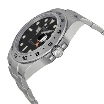 Stainless steel case with a stainless steel Rolex oyster bracelet. Fixed stainless steel bezel showing 24 hour markers. Black dial with luminous silver-tone Mercedes-logo, sword, and Breguet-style shape hands and dot hour markers. Minute markers around the outer rim. Dial Type: Analog. Luminescent hands and markers. Date display at the 3 o'clock position. Rolex calibre 3187 automatic movement with a 50-hour power reserve. Scratch resistant sapphire crystal. Screw down crown. Solid case back. Round case shape. Case size: 42 mm. Band width: 20 mm. Oysterlock clasp. Water resistant at 100 meters / 330 feet. Functions: GMT, second time zone, date, hour, minute, second, chronometer. Luxury watch style. Watch label: Swiss Made. Item Variations: m216570-0002, 216570-0002. Rolex Explorer II Black Dial Stainless Steel Oyster Bracelet Automatic Men's Watch 216570BKSO.