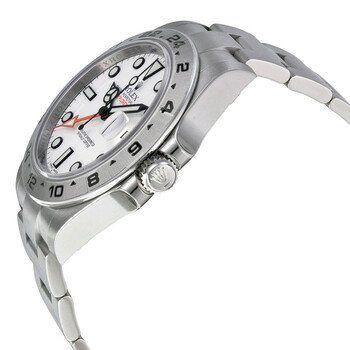 Stainless steel case with a stainless steel Rolex oyster bracelet. Fixed stainless steel bezel showing 24 hour markings. White dial with luminous black Mercedes-logo, sword, and Breguet-style hands and dot hour markers. Minute markers around the outer rim. Dial Type: Analog. Luminescent hands and markers. Date display at the 3 o'clock position. Rolex calibre 3187 automatic movement, containing 25 Jewels, bitting at 28800 vph, and has a power reserve of approximately 50 hours. Scratch resistant sapphire crystal. Screw down crown. Solid case back. Round case shape. Case size: 42 mm. Case thickness: 13 mm. Band width: 15 mm. Band length: 7.5 inches. Oysterlock clasp. Water resistant at 100 meters / 330 feet. Functions: GMT, second time zone, date, hour, minute, second, chronometer. Luxury watch style. Watch label: Swiss Made. Rolex Explorer II White Dial Stainless Steel Oyster Bracelet Automatic Men's Watch 216570WSO.