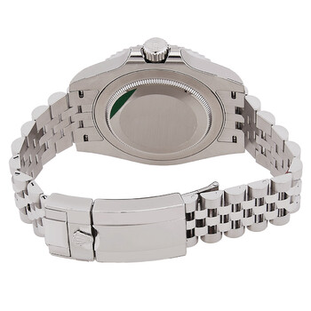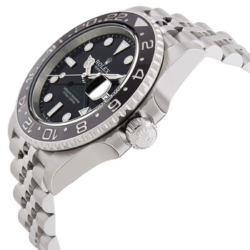 Silver-tone oystersteel case and bracelet. Bi-directional rotating two-tone (black and gray) oystersteel bezel. Black dial with silver-tone hands and batons hour markers. Minute markers around the outer rim. Dial Type: Analog. Luminescent hands and markers. Date display at the 3 o'clock position. Rolex Calibre 3285 Automatic movement, based upon Rolex 3255, containing 31 Jewels, bitting at 28800 vph, and has a power reserve of approximately 70 hours. Scratch resistant sapphire crystal. Screw down crown. Solid case back. Round case shape, case size: 40 mm. Fold over clasp. Water resistant at 100 meters / 330 feet. Functions: date, hour, minute, second. Gmt Master II Series. Luxury watch style. Watch label: Swiss Made. Item Variations: 126710GRNR-0003. Rolex Gmt Master II Automatic Black Dial Men's Watch M126710GRNR-0003.
