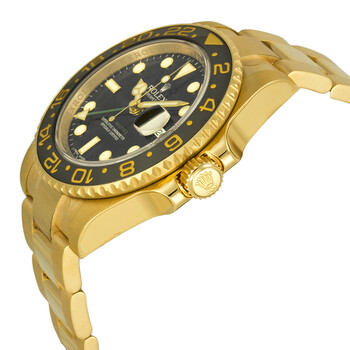 18k yellow gold case with a yellow gold-tone 18kt yellow gold rolex oyster bracelet. Bi-directional rotating 24 hour black ceramic top ring 18kt yellow gold bezel. Black dial with yellow gold-tone Mercedes-logo, sword, and Breguet-style shape hands and luminous dot hour markers. Minute markers around the outer rim. Dial Type: Analog. Luminescent hands and dial markers. Date display at the 3 o'clock position. Rolex Calibre 3186 automatic movement with a 50-hour power reserve. Scratch resistant sapphire crystal. Screw down crown. Solid case back. Round case shape, case size: 40 mm, case thickness: 12 mm. Oysterlock clasp. Water resistant at 100 meters / 330 feet. Functions: GMT, second time zone, date, hour, minute, second, chronometer. Luxury watch style. Watch label: Swiss Made. Item Variations: 116718, 116718-BKSO , Rolex-116718, Rolex-116718-BKSO 116718, 116718-BKSO, Rolex. Rolex GMT Master II Black Dial 18K Yellow Gold Oyster Bracelet Automatic Men's Watch 116718BKSO.