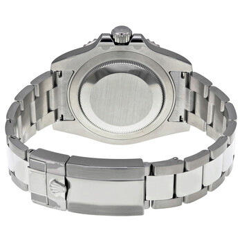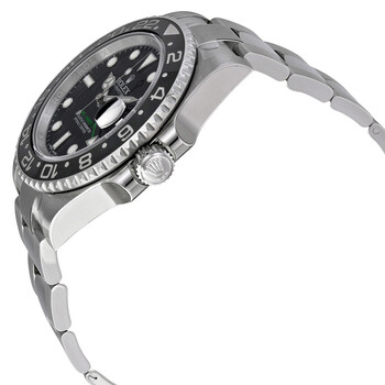 Silver-tone stainless steel case with a silver-tone stainless steel oyster bracelet. Bi-directional rotating black ceramic top ring stainless steel bezel. Black dial with luminous Mercedes-logo, sword, and Breguet-style shape hands and luminous dot hour markers. Minute markers around the outer rim. Dial Type: Analog. Luminescent hand and dial markers. Date display at the 3 o'clock position. Rolex Calibre 3186 automatic movement with a 50-hour power reserve. Scratch resistant sapphire crystal. Screw down crown. Solid case back. Round case shape, case size: 40 mm, case thickness: 12 mm. Band width: 19.5 mm. Deployment clasp. Water resistant at 100 meters / 330 feet. Functions: GMT, second time zone, date, hour, minute, second, chronometer. Additional Info: GMT timekeeping; green center hand indicates second time zone. Sport watch style. Watch label: Swiss Made. Item Variations: 116710LN, 116710-BKSO, Rolex-116710, Rolex-116710-BKSO. Rolex GMT Master II Black Index Dial Oyster Bracelet Steel Men's Watch 116710LN.