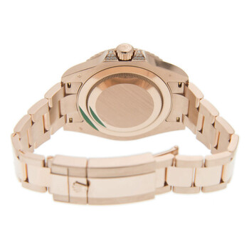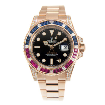 18kt rose gold case with a gold-tone 18kt rose gold bracelet. Bi-directional rotating bezel with diamond set. Black dial with index hour markers. Dial Type: Analog. Date display at the 3 o'clock position. Rolex Calibre 3186 Automatic movement, containing 31 Jewels, bitting at 28800 vph, and has a power reserve of approximately 50 hours. Scratch resistant sapphire crystal. Screw down crown. Solid case back. Case size: 40 mm. Oysterlock clasp. Functions: date, GMT, second time zone, hour, minute, second, chronometer. Additional Info: original box, international warranty card, manual (complete accessories). Gmt-master II Series. Luxury watch style. Watch label: Swiss Made. Rolex GMT-MASTER II Automatic Chronometer Diamond Black Dial Watch 126755SARU.