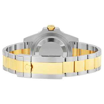 Silver-tone stainless steel case with a two-tone (silver-tone and gold-tone) stainless steel and 18kt yellow gold rolex oyster bracelet. Bi-directional rotating two-tone (black and gold-tone) 18kt yellow gold and cerachrom ceramic bezel. Black dial with yellow gold hands and dot hour markers. Minute markers around the outer rim. Dial Type: Analog. Luminescent hands and markers. Date display at the 3 o'clock position. Rolex Calibre 3186 Automatic movement, containing 31 Jewels, bitting at 28800 vph, and has a power reserve of approximately 50 hours. Scratch resistant sapphire crystal. Screw down crown. Solid case back. Round case shape, case size: 40 mm, case thickness: 12 mm. Band width: 16 mm, band length: 7 1/4 inches. Oysterlock clasp. Water resistant at 100 meters / 330 feet. Functions: GMT, second time zone, date, hour, minute, second, chronometer. Gmt-master II Series. Casual watch style. Watch label: Swiss Made. Rolex GMT-Master II Black Dial Stainless Steel and 18kt Yellow Gold Oyster Bracelet Automatic Men's Watch 116713BKSO.