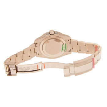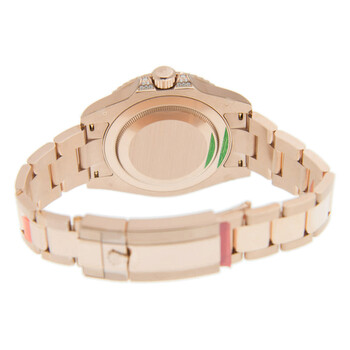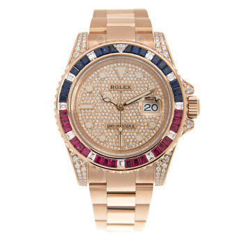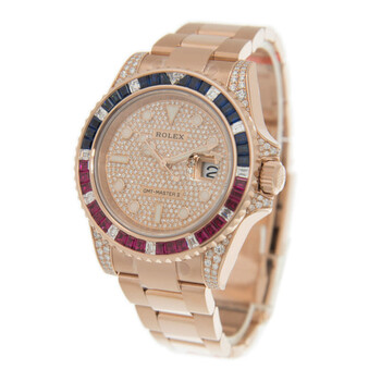 18kt rose gold case with a gold-tone 18kt yellow gold oyster bracelet. Bi-directional rotating diamond set 29 diamonds and 30 sapphires bezel. Diamond pave dial with diamond hour markers. Dial Type: Analog. Luminescent hands and markers. Date display at the 3 o'clock position. Rolex Calibre 3186 automatic movement with a 50-hour power reserve. Scratch resistant sapphire crystal. Screw down crown. Solid case back. Round case shape, case size: 40 mm, case thickness: 12 mm. Band width: 20 mm. Oysterlock clasp. Water resistant at 100 meters / 330 feet. Functions: GMT, second time zone, date, hour, minute, second. Luxury watch style. Watch label: Swiss Made. Rolex GMT-Master II Automatic Diamond Black Dial Men's Watch 126755SARU-PAVE.