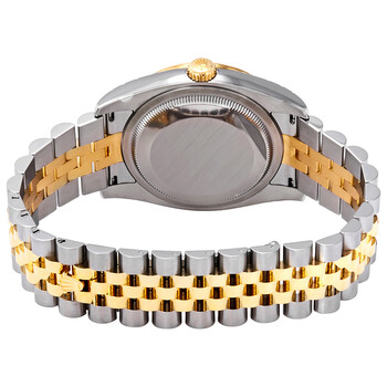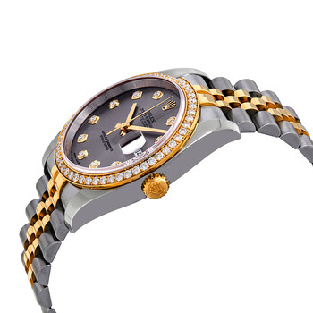 Stainless steel and 18kt yellow gold case with a stainless steel and 18kt yellow gold jubilee bracelet. Fixed-diamond set bezel. Grey dial with yellow gold hands and diamonds hour markers. Dial Type: Analog. Date display at the 3 o'clock position. Rolex Calibre 3235 automatic movement. Scratch resistant sapphire crystal. Screw down crown. Solid case back. Round case shape. Case size: 36 mm. Water resistant at 100 meters / 330 feet. Functions: date, hour, minute, second. Luxury watch style. Watch label: Swiss Made. Rolex Grey Diamond Dial Automatic Steel and 18kt Yellow Gold Jubilee Watch 116243GYDJ.