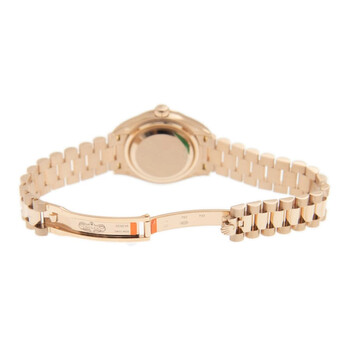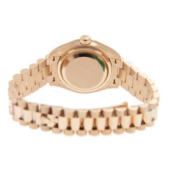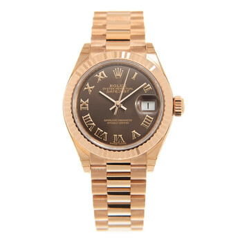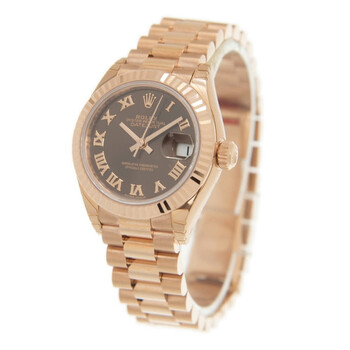 18kt rose gold case with a 18kt rose gold President bracelet. Fixed fluted 18kt rose gold bezel. Brown dial with rose gold hands and Roman numeral hour markers. Dial Type: Analog. Date display at the 3 o'clock position. Rolex calibre 2236 automatic movement, based upon Rolex 2235, containing 31 Jewels, bitting at 28800 vph, and has a power reserve of approximately 55 hours. Scratch resistant sapphire crystal. Screw down crown. Solid case back. Round case shape. Case size: 28 mm. Concealed fold over clasp. Water resistant at 100 meters / 330 feet. Functions: date, hour, minute, second. Lady Datejust Series. Luxury watch style. Watch label: Swiss Made. Item Variations: 279175-0014. Rolex Lady Datejust 18kt Rose Gold Automatic Brown Dial Ladies Watch 279175-0014.