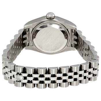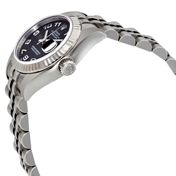 Stainless steel case with a stainless steel rolex jubilee bracelet. Fixed fluted 18kt white gold bezel. Black concentric dial with silver-tone hands and Arabic numeral hour markers. Dial Type: Analog. Date display at the 3 o'clock position. Rolex calibre 2235 automatic movement with a 48-hour power reserve. Scratch resistant sapphire crystal. Stainless steel crown. Solid case back. Case size: 26 mm. Round case shape. Deployment clasp. Water resistant at 100 meters / 330 feet. Functions: date, hour, minute, second. Luxury watch style. Watch label: Swiss Made. Rolex Lady Datejust 26 Black Concentric Dial Stainless Steel Rolex Jubilee Automatic Watch 179174BKCAJ.