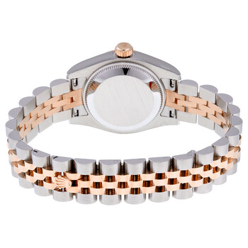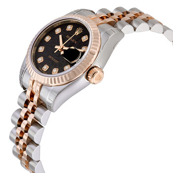 Stainless steel and 18k everose gold case with a stainless steel and 18k everose gold rolex jubilee bracelet. Fixed - fluted 18k everose gold bezel. Black dial with rose gold-tone hands and diamond hour markers. Dial Type: Analog. Date display at the 3 o'clock position. Automatic movement. Scratch resistant sapphire crystal. Solid case back. Case diameter: 26 mm. Round case shape. Water resistant at 100 meters / 330 feet. Functions: date, hour, minute, second. Luxury watch style. Watch label: Swiss Made. Rolex Lady Datejust 26 Black Dial Stainless Steel and 18K Everose Gold Rolex Jubilee Automatic Watch 179171BKJDJ.