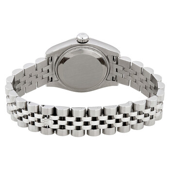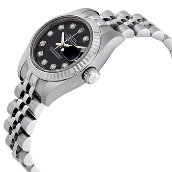 Stainless steel case with a stainless steel Rolex jubilee bracelet. Fixed fluted 18kt white gold bezel. Black dial with silver-tone hands and diamond hour markers. Dial Type: Analog. Date display at the 3 o'clock position. Automatic movement with a 48-hour power reserve. Scratch resistant sapphire crystal. Case diameter: 26 mm. Round case shape. Hidden deployment clasp. Water resistant at 100 meters / 330 feet. Functions: date, hour, minute, second. Luxury watch style. Watch label: Swiss Made. Item Variations: 179174, 179174-BKDJ, Rolex-179174, Rolex-179174-BKDJ. Rolex Lady Datejust 26 Black Dial Stainless Steel Rolex Jubilee Automatic Watch 179174BKDJ.