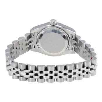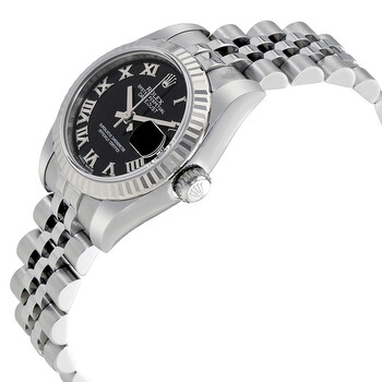 Stainless steel case with a stainless steel Rolex jubilee bracelet. Fixed fluted 18kt white gold bezel. Black dial with silver-tone hands and Roman numeral hour markers. Minute markers around the outer rim. Dial Type: Analog. Date display at the 3 o'clock position. Automatic movement with a 48-hour power reserve. Scratch resistant sapphire crystal. Solid case back. Case diameter: 26 mm. Round case shape. Hidden deployment clasp. Water resistant at 100 meters / 330 feet. Functions: date, hour, minute, second. Additional Info: date displays at 3 o'clock position. Luxury watch style. Watch label: Swiss Made. Item Variations: 179174, 179174-BKRJ, Rolex-179174, Rolex-179174-BKRJ. Rolex Lady Datejust 26 Black Dial Stainless Steel Rolex Jubilee Automatic Watch 179174BKRJ.
