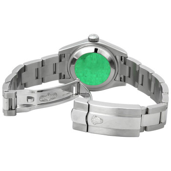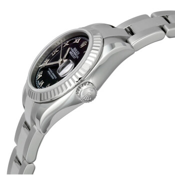 Stainless steel case with a stainless steel rolex oyster bracelet. Fixed - fluted 18k white gold bezel. Black dial with silver-tone hands and Roman numeral hour markers. Minute markers around the outer rim. Dial Type: Analog. Date display at the 3 o'clock position. Automatic movement. Scratch resistant sapphire crystal. Case diameter: 26 mm. Round case shape. Hidden deployment clasp. Water resistant at 100 meters / 330 feet. Functions: date, hour, minute, second. Luxury watch style. Watch label: Swiss Made. Rolex Lady Datejust 26 Black Dial Stainless steel Rolex Oyster Automatic Watch 179174BKRO.
