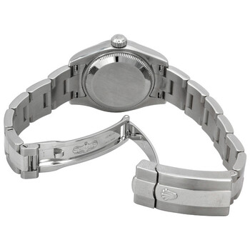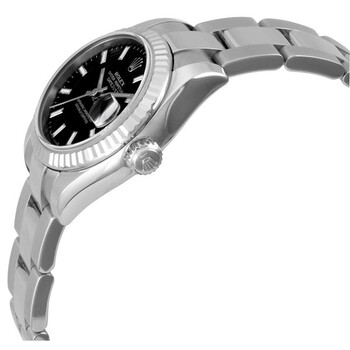 Stainless steel case with a stainless steel Rolex oyster bracelet. Fixed fluted 18k white gold bezel. Black dial with luminous silver-tone hands and luminous stick hour markers. Minute markers around the outer rim. Dial Type: Analog. Luminescent hands and dial markers. Date display at the 3 o'clock position. Rolex calibre 2235 automatic movement with a 48-hour power reserve. Scratch resistant sapphire crystal. Screw down crown. Solid case back. Round case shape. Case size: 26 mm. Oysterlock clasp. Water resistant at 100 meters / 330 feet. Functions: date, hour, minute, second, chronometer. Luxury watch style. Watch label: Swiss Made. Rolex Lady Datejust 26 Black Dial Stainless steel Oyster Bracelet Automatic Watch 179174BKSO.