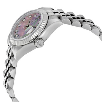 Stainless steel case with a stainless steel Rolex jubilee bracelet. Fixed fluted 18kt white gold bezel. Black mother of pearl dial with silver-tone hands and diamond hour markers. Dial Type: Analog. Date display at the 3 o'clock position. Automatic movement with a 48-hour power reserve. Scratch resistant sapphire crystal. Stainless steel crown. Solid case back. Case diameter: 26 mm. Round case shape. Deployment clasp. Water resistant at 100 meters / 330 feet. Functions: date, hour, minute, second. Luxury watch style. Watch label: Swiss Made. Rolex Lady Datejust 26 Black Mother of Pearl Dial Stainless Steel Rolex Jubilee Automatic Watch 179174BMDJ.
