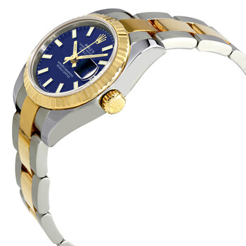 Stainless steel and 18k yellow gold case with a stainless steel and 18k yellow gold rolex oyster bracelet. Fixed - fluted 18k yellow gold bezel. Blue dial with yellow gold-tone hands and index hour markers. Dial Type: Analog. Luminescent hands and markers. Date display at the 3 o'clock position. Automatic movement. Scratch resistant sapphire crystal. Screw down crown. Case diameter: 26 mm. Round case shape. Oysterclasp clasp. Water resistant at 100 meters / 330 feet. Functions: date, hour, minute, second. Luxury watch style. Watch label: Swiss Made. Rolex Lady Datejust 26 Blue Dial Stainless Steel and 18K Yellow Gold Rolex Oyster Automatic Watch 179173BLSO.