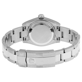 Stainless steel case with a stainless steel rolex oyster bracelet. Fixed - fluted 18k white gold bezel. Blue dial with silver-tone hands and diamond hour markers. Dial Type: Analog. Date display at the 3 o'clock position. Automatic movement. Scratch resistant sapphire crystal. Screw down crown. Case diameter: 26 mm. Round case shape. Oyster clasp. Water resistant at 100 meters / 330 feet. Functions: date, hour, minute, second. Luxury watch style. Watch label: Swiss Made. Rolex Lady Datejust 26 Blue Dial Stainless Steel Rolex Oyster Automatic Watch 179174BLDO.