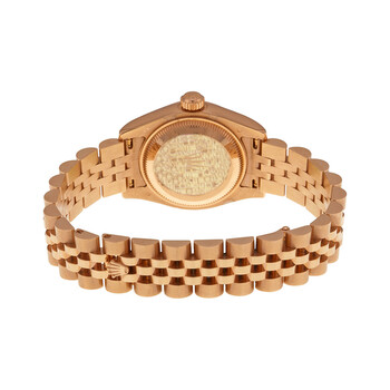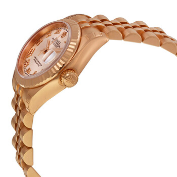 18k pink gold case with a 18k pink gold rolex jubilee bracelet. Fixed - fluted 18k pink gold bezel. Champagne dial with pink gold-tone hands and Roman numeral hour markers. Minute markers around the outer rim. Dial Type: Analog. Date display at the 3 o'clock position. Automatic movement. Scratch resistant sapphire crystal. Screw down crown. Solid case back. Case diameter: 26 mm. Round case shape. Deployment with push button release clasp. Water resistant at 100 meters / 330 feet. Functions: date, hour, minute, second. Luxury watch style. Watch label: Swiss Made. Rolex Lady Datejust 26 Champagne Dial 18K Pink Gold Rolex Jubilee Automatic Watch 179175CRJ.