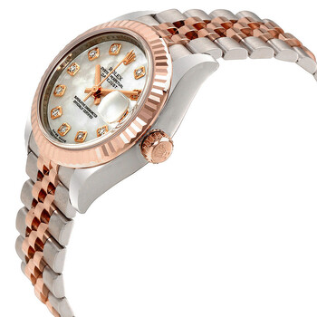 Stainless steel case with a stainless steel Rolex jubilee bracelet with 18kt everose gold center links. Fixed fluted 18kt everose gold bezel. Mother of pearl dial with rose gold-tone hands and diamond hour markers. Dial Type: Analog. Date display at the 3 o'clock position. Rolex calibre 2235 automatic movement with a 48-hour power reserve. Scratch resistant sapphire crystal. Screw down crown. Solid case back. Case size: 26 mm. Round case shape. Water resistant at 100 meters / 330 feet. Functions: date, hour, minute, second. Luxury watch style. Watch label: Swiss Made. Rolex Lady Datejust 26 Mother of Pearl Dial Stainless Steel and 18K Everose Gold Rolex Jubilee Automatic Watch 179171MDJ.