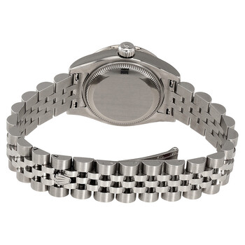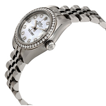 Silver-tone stainless steel case with a silver-tone stainless steel rolex jubilee bracelet. Fixed 18kt white gold diamond set bezel. Mother of pearl dial with silver-tone hands and diamond hour markers. Dial Type: Analog. Date display at the 3 o'clock position. Rolex Calibre 2235 Automatic movement, containing 31 Jewels, bitting at 28800 vph, and has a power reserve of approximately 48 hours. Scratch resistant sapphire crystal. Screw down crown. Solid case back. Round case shape. Case size: 26 mm. Concealed crown clasp. Water resistant at 100 meters / 330 feet. Functions: date, hour, minute, second, chronometer. Luxury watch style. Watch label: Swiss Made. Rolex Lady Datejust 26 Mother of Pearl Dial Stainless Steel Jubilee Bracelet Automatic Watch 179384MDJ.